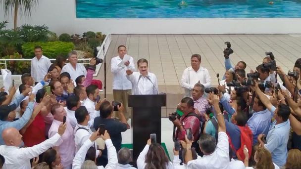 También lo acompañaron el delegado del CEN de Morena con funciones de dirigente, César Burelo; el líder del PRI, Pedro Gutiérrez, del PVEM Miguel Ángel Vélez; y de Movimiento Ciudadano, Fanny Vargas. Asimismo la presidenta de la JUCOPO del Congreso local, Beatriz Milland, así como funcionarios estatales, líderes religiosos como el obispo Gerardo de Jesús Rojas López y representantes de la sociedad civil.
