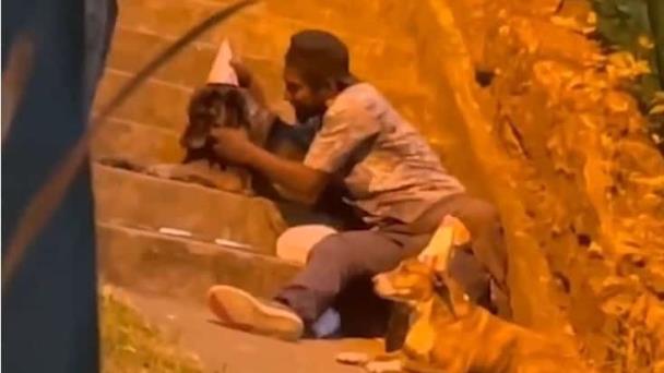 En el video, que ya se ha vuelto viral en redes sociales, se observa cómo el hombre se sienta en unas escaleras del barrio Cabecera, le coloca unos gorros de fiesta a sus mascotas y de una bolsa saca un pastel.