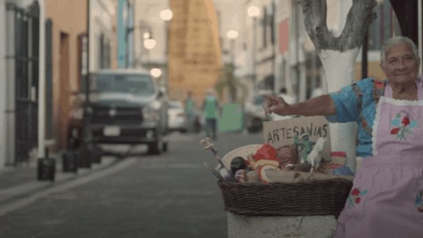 En esta toma, que no dura más de un segundo, se observa al fondo el obelisco de la Plaza Bicentenario, además que la señora tiene a su lado una canasta con un letrero que dice artesanías.