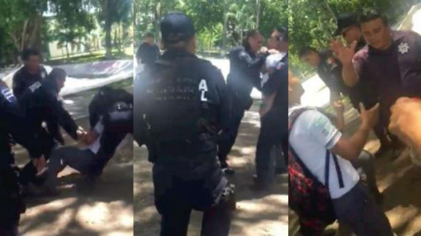 En el video con una duración de un minuto con 36 segundos se observa a un grupo de elementos de la policía y otro de estudiantes que discuten luego de que tres de los efectivos tratan de levantar al joven que se cae al evitar ser detenido.