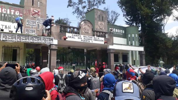 Realizaron pintas en la fachada de la puerta 1 de la instalación militar, con frases como “Fue el Ejército", "Asesinos" y "Nos faltan 43"; también lanzaron artefactos explosivos y derribaron el zaguán de la entrada principal, al grito de “asesinos”