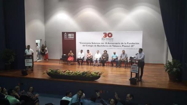 “El plantel 29 inició con su vida y trayectoria académica en el turno vespertino el 4 de septiembre de 1989, en las instalaciones de la Escuela Secundaria Federal número 5. La grandeza de un ideal se ve reflejado en la capacidad de invitar y atraer a personas que crean y apuesten por el mismo, la visión educativa del Colegio de Bachilleres de Tabasco ha contado con la colaboración del personal docente, administrativo y directivo, que han brindado a lo largo de estos 30 años de servicio, su mejor esfuerzo y dedicación”, expuso.