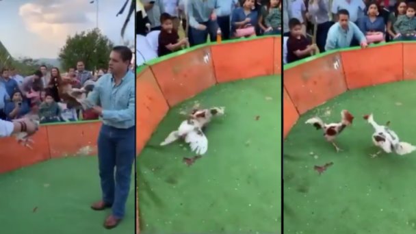 En Instagram, el hijo de la funcionaria compartió los videos, en donde se observa el enfrentamiento de dos gallos, además se observa un escenario en donde toca una agrupación.