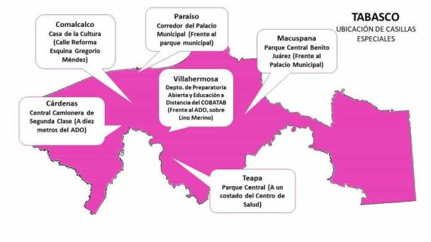 La Casilla Especial del Distrito Federal 01, estará ubicada en el Parque Central Benito Juárez, de la cabecera municipal de Macuspana, frente al Palacio Municipal.