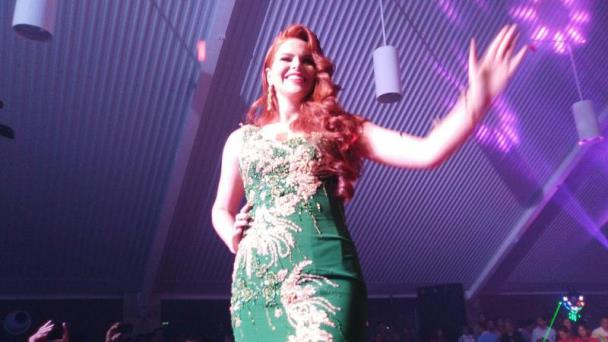 Con un ceñido vestido color verde, Constanza Ferrer subió al escenario adornado con rosas rojas e hizo un breve recorrido, bajo el ruido de la música de tamborileros y el grito de apoyo de las porras que desde temprano llegaron al salón Villahermosa del parque Tomás Garrido.