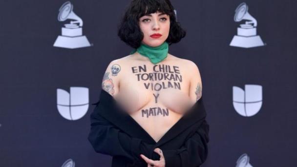 La cantante chilena, Mon Laferte, mostró sus pechos con la leyenda “En Chile, torturan, violan y matan”, al momento de ser fotografiada y grabada por los medios de comunicación durante la pasarela de los Grammy Latinos.