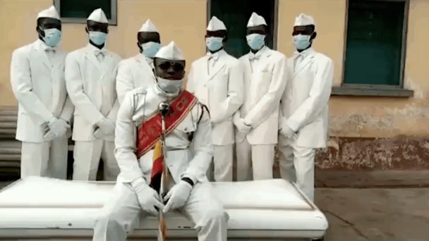 A través de un video publicado en su cuenta de Twitter, Benjamín Aidoo, líder de este grupo de bailadores, acompañado de sus compañeros que visten de blanco y portan cubrebocas, dijo que aquellas personas que no tienen necesidad de salir, que se queden en casa, o de lo contrario bailarán con ellos, haciendo referencia al servicio que prestan en aquel país.
