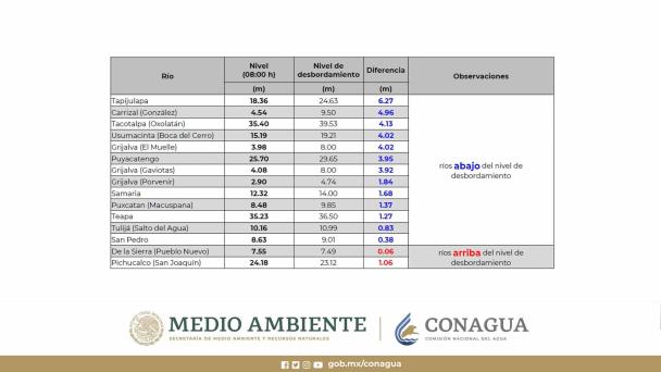 La dependencia federal precisó que, hasta las 8:00 de la mañana de este sábado, el río Pichucalco, que atraviesa los municipios de Teapa y Centro, se encontraba un metro y seis centímetros por encima de su nivel; el de La Sierra, que atraviesa Tacotalpa, Jalapa y Centro, tenía a esa hora seis centímetros de desbordamiento.
