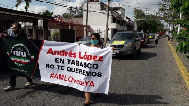 A través de pancartas como "AMLO vete, mentiroso"; "Somos FRENA, López vete ya. En Tabasco no queremos comunismo"; "Fuera AMLO, Fuchi KKS"; "AMLO, vete ya", tabasqueños abordo de aproximadamente 15 vehículos y una motocicleta, acusaron que el mandatario federal quiere convertir su gobierno al comunismo, chavismo y bolivariano.
