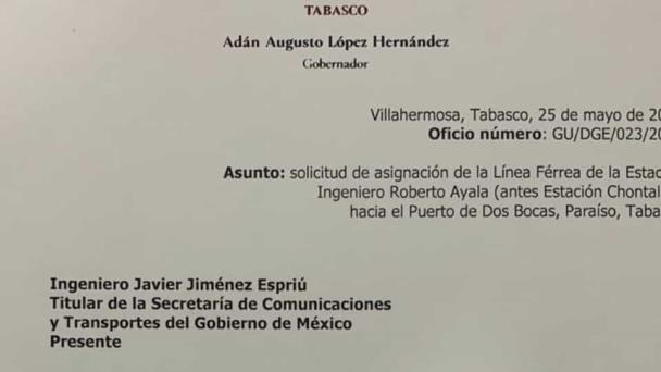 En el oficio número: GU/DGE/023/2020, el gobernador manifiesta el interés de su administración para realizar los trámites y gestiones para que le sea asignado esta vía general de comunicación ferroviaria, así como prestar el servicio público de transporte ferroviario y los servicios auxiliares de la Línea Férrea que conduce de la Estación “Ingeniero Roberto Ayala”, antes Estación Chontalpa, en Huimanguillo, hacia el Puerto de Dos Bocas, en Paraíso, donde se construye la nueva refinería de México.