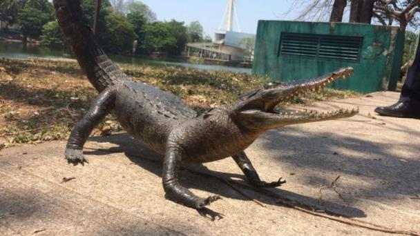 Telereportaje acudió al lugar, pero inmediatamente se notó que el animal joven, de menos de un metro de longitud, se encontraba en una posición poco usual de su especie para tomar el sol.