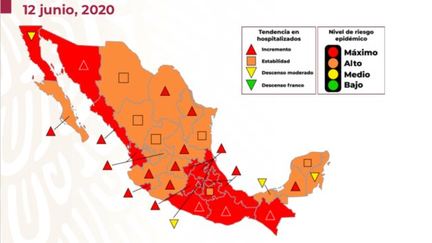 El director general de Promoción de la Salud, Ricardo Cortés Alcalá, explicó que los estados de Aguascalientes, Baja California Sur, Campeche, Chihuahua, Coahuila, Durango, Guanajuato, Jalisco, Michoacán, Nuevo León, Quintana Roo, San Luis Potosí, Tabasco, Tamaulipas, Yucatán y Zacatecas, pasaron al color naranja, que significa en el semáforo epidémico un riesgo alto, mientras que el resto quedará en semáforo rojo, es decir, máximo riesgo.