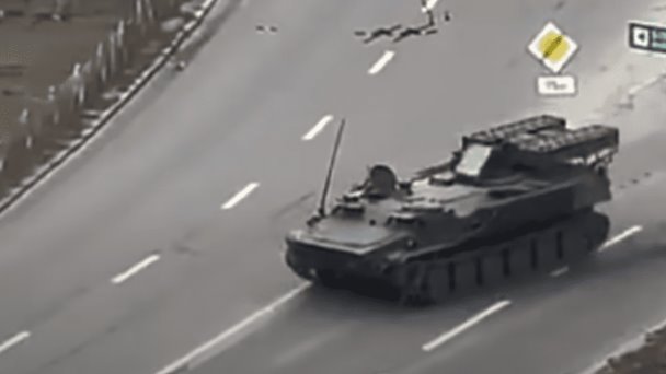 Tanque ruso aplasta auto con una persona dentro, en calles de Kiev