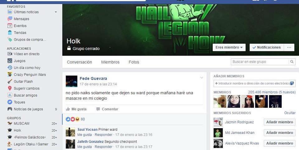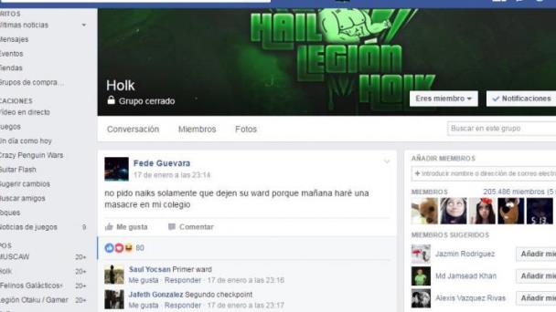 En uno de los mensajes de Facebook una persona que se hace llamar Fede Guevara publicó en el grupo que se hace llamar Hail Región Holk el día 17 de enero que el día 18 haría una masacre en su colegio.