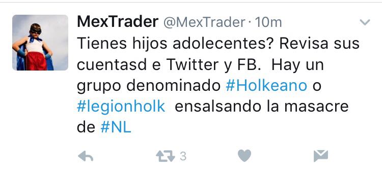 Por ejemplo, otra cuenta de Twitter dice: “Tienes hijos adolescentes? Revisa sus cuentas de Twitter y FB. Hay un grupo denominado #Holkeano o #legiónholk ensalzando la masacre de #NL.