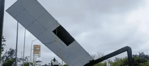 Los hechos ocurrieron en el carril que va de Coatzacoalcos a Nanchital, cuando el peso de la señalética no soportó las rachas de viento.