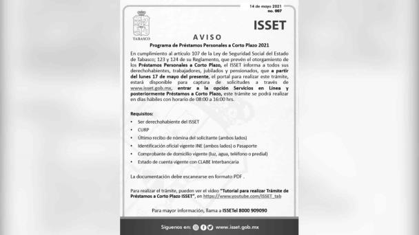 El ISSET anunció que el próximo lunes estará disponible el portal web para que los derechohabientes, trabajadores jubilados o pensionados, realicen el trámite para el otorgamiento de Préstamos Personales a Corto Plazo.