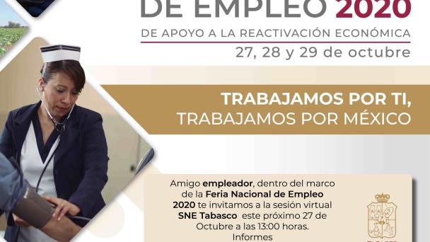 El Servicio Nacional de Empleo Tabasco (SNET), anunció la realización de la “Feria Nacional de Empleo de Apoyo a la Reactivación Económica 2020”, donde se ofertarán 652 vacantes.