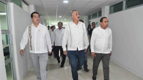 En su segundo punto, Merino Campos visitó la División Académica Multidisciplinaria, donde junto al rector de la UJAT, Guillermo Narváez Osorio, cortó el listón inaugural de la construcción de los edificios H, I y J que alberga la biblioteca de la división; así como la pavimentación de concreto, subestación eléctrica, red de agua potable y obra exterior con una inversión superior a los 70 millones de pesos.