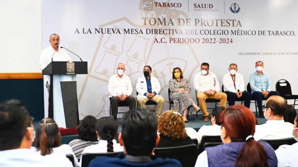 El gobernador Carlos Manuel Merino Campos encabezó la ceremonia de toma de protesta del doctor Benjamín Salomón Alcocer Gaxiola como presidente de la nueva mesa directiva del Colegio Médico de Tabasco para el periodo 2022-2024.