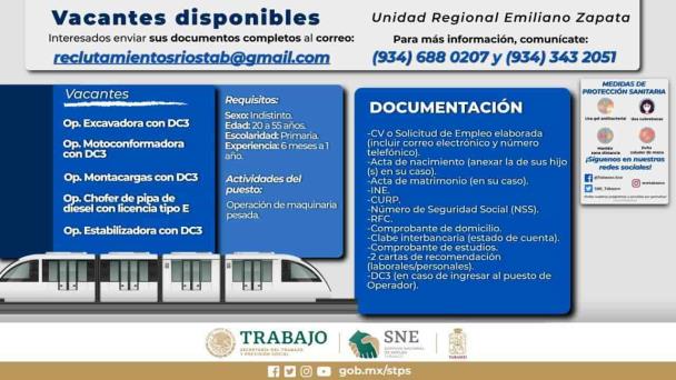 Entre los requisitos requeridos se encuentra una solicitud de empleo elaborada, acta de nacimiento, INE, CURP, número de seguridad social, comprobante de domicilio y dos cartas de recomendación, además de que los interesados deberán ingresar a la cuenta en Facebook Tren Maya Tabasco o comunicarse al 934 688 0207 o 934 343 2051.