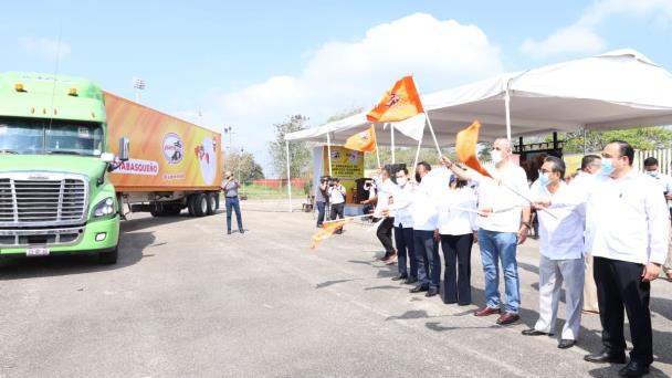 El gobernador Carlos Manuel Merino Campos; el director General de Industrias Charricos, Eliazar Cabrera Paredes; la presidenta municipal de Centro, Yolanda Osuna Huerta; asñi como funcionarios y empresarios, dieron el banderazo de salida al contenedor, que lleva 32 mil 472 latas de hojuelas de plátano en sus tres diferentes sabores.
