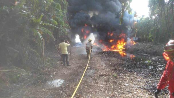 El coordinador municipal de Protección Civil en Cárdenas, Humberto Lazo Córdova, refirió que debido a que el terreno quedó impregnado por los residuos, se presentó un incendio que abarcó unos cañales.