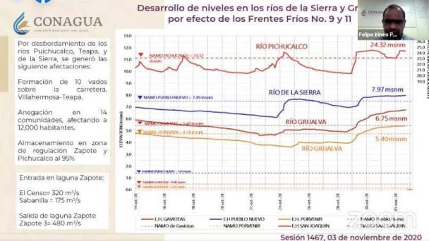Durante su sesión ordinaria del Comité Nacional de Grandes Presas, el Subgerente técnico de la dirección de Conagua Tabasco, Luis Antonio Cabrera, detalló que estos afluentes superaron sus Niveles de Aguas Máximos Ordinarios (NAMO).