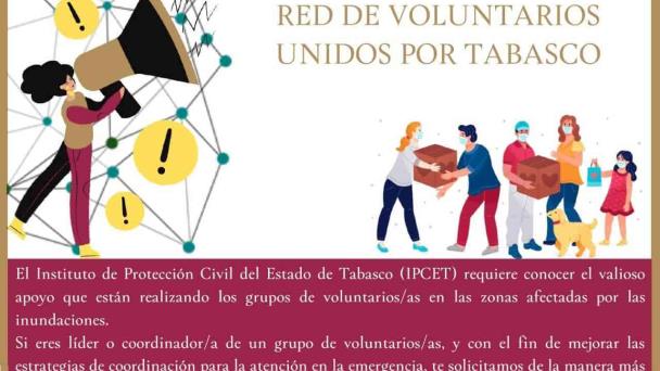 Para mejorar las estrategias de coordinación para la atención en la emergencia atmosférica que vive el estado, el Instituto de Protección Civil de Tabasco, convocó a todos los grupos de ayuda para registrarse en la Red de Voluntarios Unidos por Tabasco para que el apoyo a las personas afectadas fluya de manera ordenada.