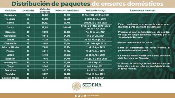 De acuerdo al documento oficial, la entrega se realizará entre el 21 de diciembre de 2020 al 16 de septiembre de 2021, siendo las localidades afectadas de Macuspana las primeras que reciban los enseres, en tanto que las localidades de Emiliano Zapata, serán las últimas en obtener el beneficio.