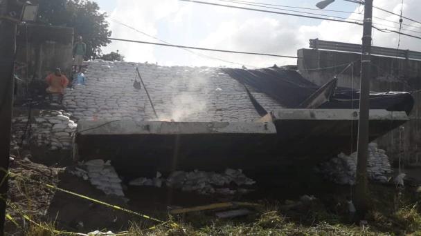 Para evitar un deslizamiento de la tierra, reforzaron momentáneamente con 20 mil costales de arena el espacio del muro lateral derecho, donde se cayó la estructura.