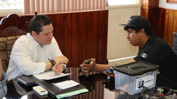 Esta mañana, el alcalde de Cunduacán Jesús Abraham Cano González recibió en la sala de cabildo a los jóvenes Alled Jared Torres González y Fernando Jiménez López, ganadores del segundo lugar en el Torneo Internacional "Intelibots Tournament 2023" realizado en San Juan Teotihuacán, Estado de México.