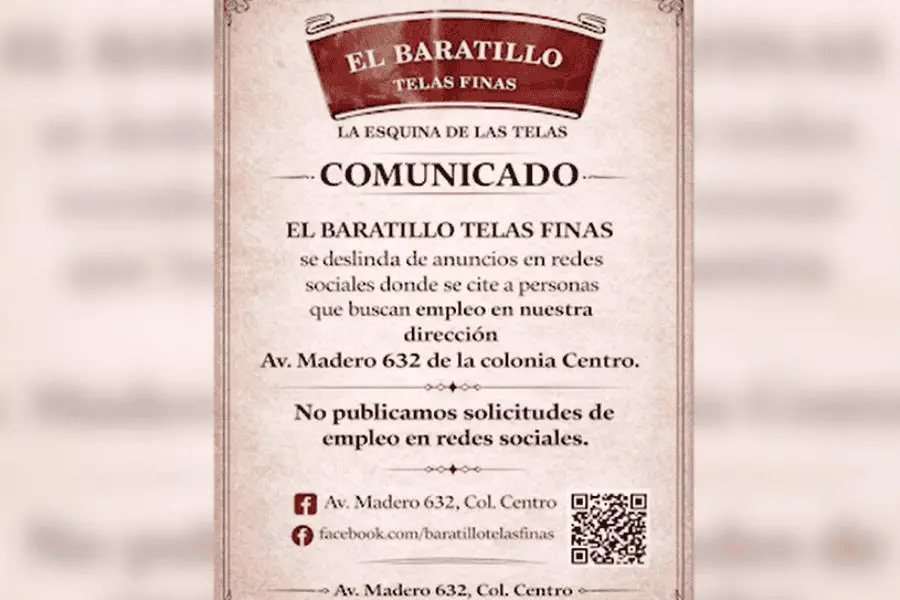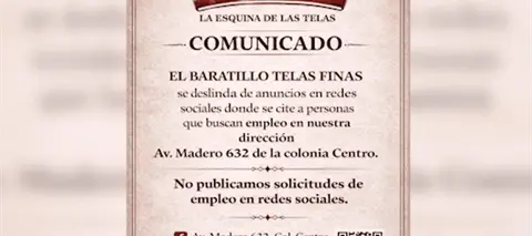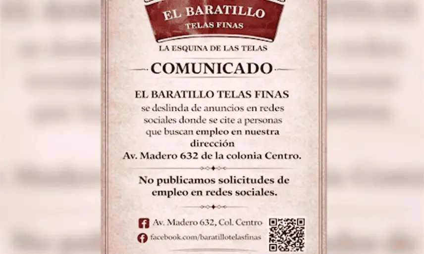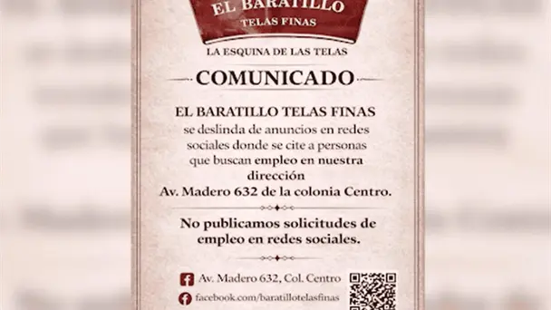 A través de un comunicado, Telas El Baratillo se deslindó de una publicación en redes sociales, donde solicitaban empleados, dando como dirección, el local de esta tienda.