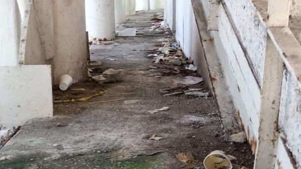 También se puede observar mucha basura acumulada y corrosión en varias partes de la estructura.