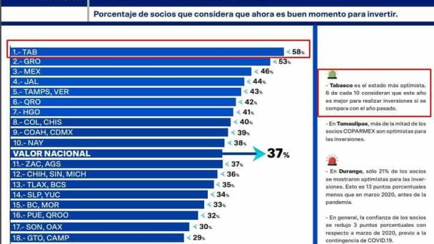 Tabasco se posicionó como el estado más optimista del país para invertir, pese a la pandemia, durante el mes de julio, reveló la medición #DataCoparmex que se realiza a nivel nacional.