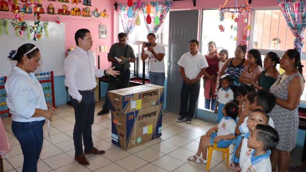El presidente municipal de Cunduacán, Abraham Cano, entregó un aire acondicionado en el jardín de niños María de Los Ángeles Pardo Castro, ubicado en Culico 1ra sección.