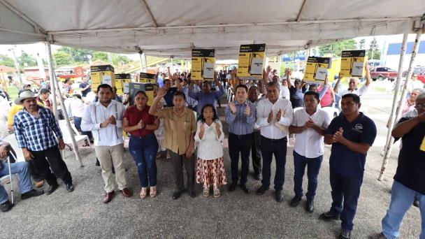 El gobierno de Cunduacán entregó 90 bombas aspersoras a pequeños productores de cacao, caña, plátano y maíz en el parque central del Poblado Carlos Rovirosa.