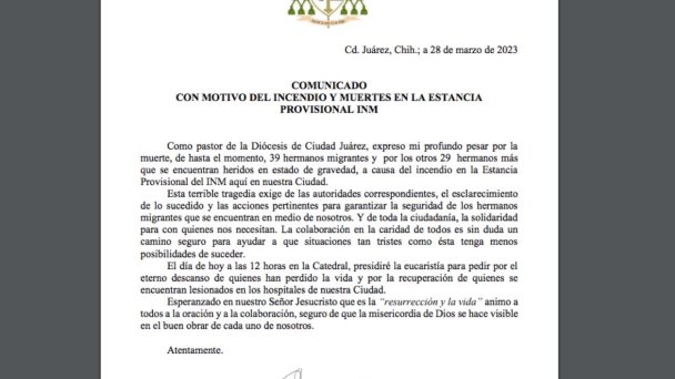 La Diócesis de Ciudad Juárez, Chihuahua lamentó el incendio en donde murieron 39 migrantes y exigió a las autoridades el esclarecimiento de los hechos.