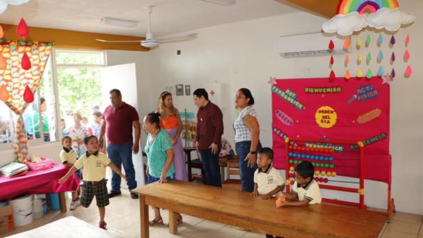 El alcalde Abraham Cano entregó un aula en el jardín de niños María del Pilar Pineda Morales en la comunidad de Ignacio Zaragoza.