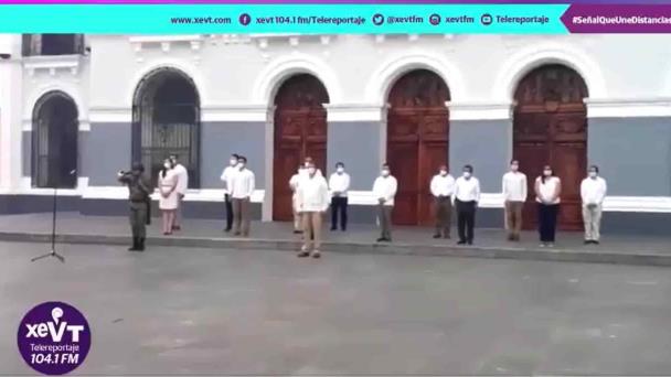 Con la bandera a media asta, como todos los días los presentes guardaron un minuto de silencio y se efectuó el homenaje para posteriormente rendir un minuto de aplausos en reconocimiento de los trabajadores del sector salud que se mantienen en la batalla contra esta enfermedad que en la entidad ha dejado ya más de dos mil 650 fallecidos.