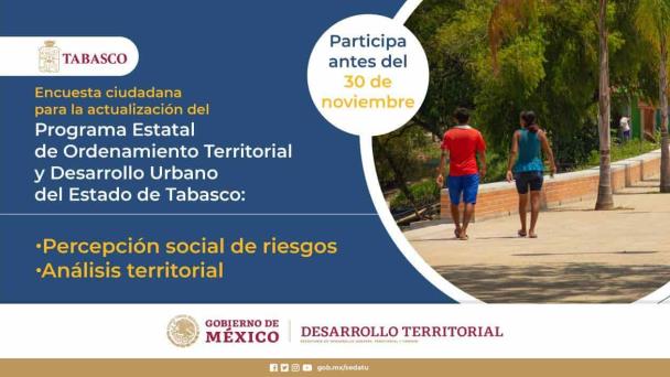La Secretaría de Desarrollo Agrario, Territorial y Urbano (SEDATU), lanzó la convocatoria a la población para participar en la encuesta ciudadana para la actualización del Programa Estatal de Ordenamiento Territorial y Desarrollo Urbano del Estado de Tabasco.