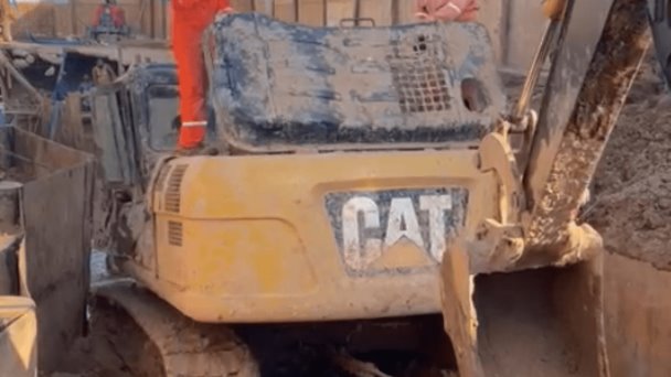 La pesada unidad de la marca CAT fue retirada del hundimiento con auxilio de un tráiler grúa y con otros equipos.
