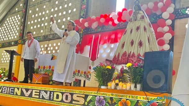“En este momento vamos a recibir a la Virgen con su nuevo vestido que le han traído en promesa, fuerte el aplauso, los que nos siguen por la radio, la Virgen trae un vestido con frutos propios de la zona, cacao, una guacamaya que era un animal sagrado para los mayas, y frutas tabasqueñas…y le pedimos al obispo Juan Manuel que haga el honor de cortar el listón y dar inicio así simbólicamente las fiestas de agosto de la Santísima Virgen 2023…”, destacó.