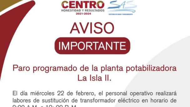 El ayuntamiento de Centro anunció que este miércoles detendrá sus operaciones la potabilizadora La Isla II por trabajos de mantenimiento.