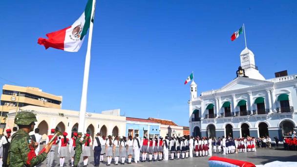El evento estuvo encabezado por el gobernador Carlos Manuel Merino Campos, pero el mensaje oficial estuvo a cargo de la secretaria para el Desarrollo Energético, María Luisa Somellera Corrales, quien destacó que la Cuarta Transformación tiene los mismos anhelos de la Bandera.