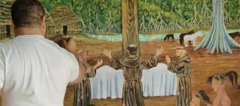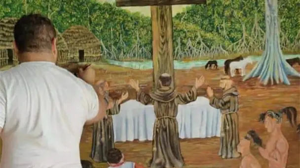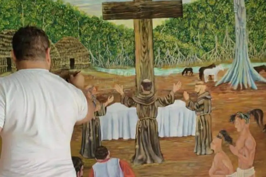 El artista plástico Kevin Montejo plasmó en una obra pictórica, la escena de la primera misa que se celebró en Tabasco en 1519, oficiada por Fray Bartolomé de Olmedo.