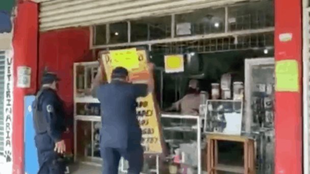 Mediante un video circulado en redes sociales, se observa cómo los oficiales le indican en un primer momento al propietario de una papelería ubicada en el fraccionamiento Bosques de Saloya, que cerrara su establecimiento.