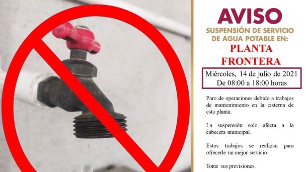 La Comisión Estatal de Agua y Saneamiento (CEAS), informó que hará un paro de operaciones en la planta Frontera por mantenimiento en la cisterna en un horario de 8:00 a 18:00 horas.