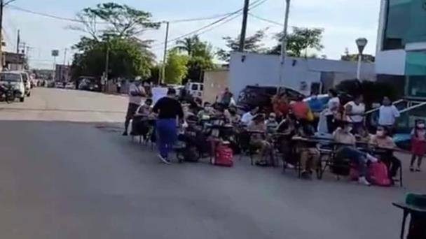 Por tercer día, alumnos de primaria en Macuspana toman clase en las calles