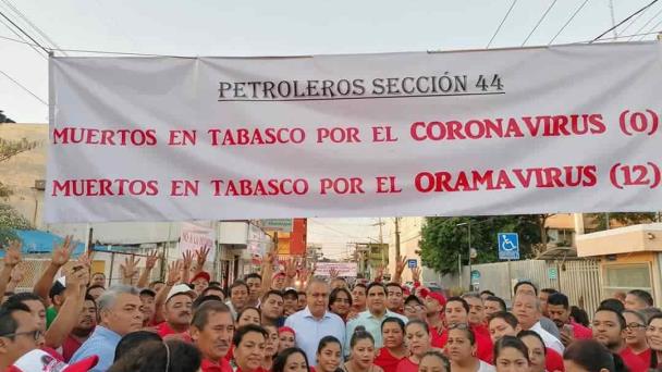 Dentro de las lonas colocadas había una que versaba: Coronavirus 0, Oramavirus 12, en relación a José Luis Oramas Vargas, titular del Hospital Regional de Pemex, a quien responsabilizan del mal servicio que brinda la institución.